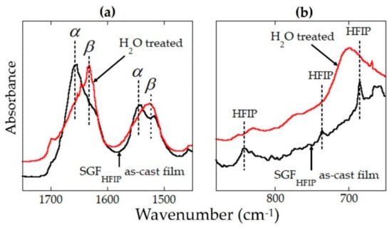 For use as a biomaterial, residual HFIP in the SGFHFIP as-cast film must be removed. Kameda et al. reported successful removal of residual HFIP from a film cast from hornet silk by rinsing in water []. To evaluate if this strategy could be applicable in the current study, the SGFHFIP as-cast film was immersed in water for 12 h and its structural properties in the dry state were characterized by FTIR. FTIR spectra of the as-cast and water-treated SGFHFIP films were as shown in Figure 9. Owing to its high affinity for water, residual HFIP dissolved when the SGFHFIP as-cast film was immersed in water, as confirmed by the disappearance of the peaks assigned to HFIP (Figure 9b). The now-HFIP-free SGFHFIP film, thought to be similar to the LFaq as-cast film, did not dissolve in water, instead, a shift to higher wavenumbers of the amide I and II vibrational bands was detected in its FTIR spectrum in the dry state. This indicates an occurrence of water induced β-sheet formation from the aggregated α-helix structure (Figure 9a). β-sheet formation is well known to induce water-resistance in SF-based materials [], hence the difference in water resistance between the LFaq and SGFHFIP as-cast films. Moreover, structural change, back to the α-helical conformation, attributed to preferences of the polyalanine domains in hydrophobic and hydrophilic environments, respectively, upon drying of water-treated artificial spidroins has been reported [,]. However, the dominant structure of the water-treated SGFHFIP film in the wet state remains unclarified and will be of interest in our future investigations.