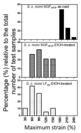 Relative frequency distribution of the maximum strain (%) of the as-cast SGFHFIP, and 80%-EtOH SGFHFIP and LFaq films.