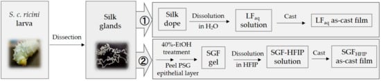 To overcome this shortcoming, fabrication of biomaterials using liquid fibroin (LF) obtained directly from the posterior silk gland (PSG) of mature S. c. ricini larvae has been explored [,,]. As earlier reported, films cast from S. c. ricini LF at room temperature (~23 °C), as shown in route ① in Scheme 1 were α-helix-rich []. In addition, it takes several minutes to collect workable amounts of LF from the PSG of S. c. ricini, that is, this fabrication approach is a time-consuming downside, if large-scale applications are desirable. Moreover, the LF-based films are water-soluble [,], and require post-treatment to induce water resistance, a desirable property for wet-state applications. β-sheet formation, often induced by treatment with aqueous alcohol solutions, and thermal- and water-vapor annealing (refer to Yoshioka et al. [] and references therein), is the most widely used strategy to render the biomaterials water-resistant. However, such post-treatments often modify inherent desirable properties of the LF-based materials, limiting their applicability []. Thus, the need for an alternative fabrication strategy for S. c. ricini silk, and indeed other wild silks, is imperative, owing to their attractive mechanical properties, biocompatibility, biodegradation, and abundant yields in nature [,].
