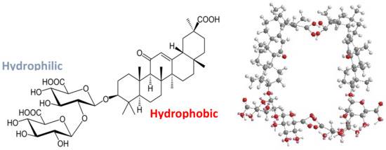 Glycyrrhizic acid (GA) is a saponin extracted from licorice root. Like most saponins, the GA molecule has an amphiphilic structure. It contains a hydrophilic part— a glucuronic acid residue—and a hydrophobic part—a glycyrrhetic acid residue (see Figure 3).