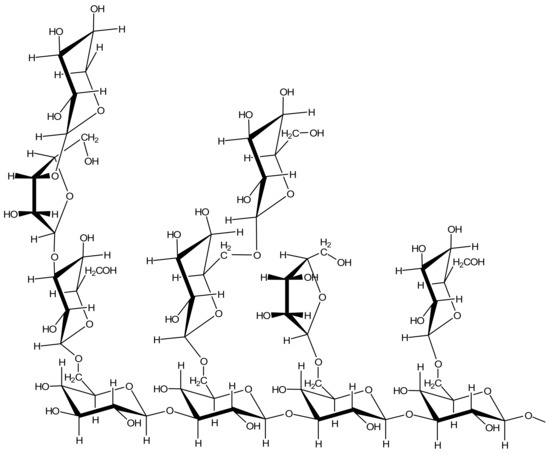 The next “host molecule” for carotenoid encapsulation and delivery described in the literature is polysaccharide arabinogalactan (AG, Figure 4). AG is a natural branched polymer consisting of arabinose and galactose units with a molecular mass near 16 kDa extracted primarily from Western and Siberian larch [71,72].