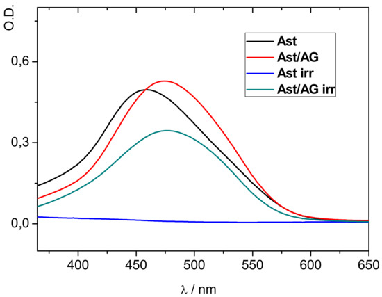 As an example, Figure 5 demonstrates the difference in the photodegradation rate of astaxanthin in pure form and in the complex with arabinogalactan ([AG] = 0.1 mM) in the presence and in the absence of irradiation. The authors proposed that the main mechanism of enhanced photo stability of carotenoids in a polysaccharide complex is their isolation from water by incorporation into the hydrophobic polymer environment.