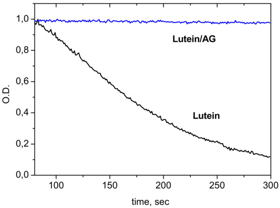 Incorporation of carotenoids into the hydrophobic polymer environment results also in enhancement of their chemical stability. The complete inhibition of oxidation of the carotenoids lutein and zeaxanthin by Fe3+ ions as an electron acceptor and by ozone molecules as powerful oxidant was achieved by complexation with AG [60]. Oxidation of carotenoids by Fe3+ ions results in formation of carotenoid radical cation, and this reaction was described in details in our earlier studies [16,78]. On the other hand, radical cations of carotenoids are unstable in aqueous solutions due to fast deprotonation and formation of carotenoid neutral radicals [79]. Figure 6 demonstrates an example of the difference in the oxidation rate of lutein by ozone in pure form and in the complex with AG in aqueous solution.