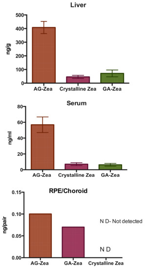 An important question is whether the described features of the complexes (solubility, membrane permeability, stability) affect the bioavailability of carotenoids in living systems. To answer this question, Li and coauthors [61] investigated the retinal accumulation of macular carotenoids in wild type mice when fed with zeaxanthin and lutein using an optimized carotenoid feeding method. Macular carotenoids are well-known natural antioxidants and light screening compounds that are capable of quenching singlet oxygen and other free radicals and absorbing potentially damaging blue light [82]. Supplementation with macular carotenoid can prevent and reduce the risk of age-related macular degeneration and other ocular disease. The authors performed HPLC analysis revealed that zeaxanthin and lutein were detected in serum, liver and RPE/choroid of the mice. Significantly higher amounts of lutein and zeaxanthin were detected when they use carotenoid/AG complex instead of crystalline carotenoids. Interestingly, only the GA and AG complexes are able to successfully deliver zeaxanthin into the RPE/choroid of WT mice (see Figure 7).
