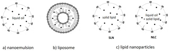 Lipid-based nanocarriers: (a) O/W nanoemulsion: Liquid oil in continuous aqueous phase stabilized by surfactant (amphiphilic molecule, in gray). Carotenoid molecules are shown as black dots. (b) Liposome: concentric phospholipid bilayer with a hydrophilic center. Carotenoids shown as black dots are imbedded in the hydrophobic area of the bilayer. (c) Lipid nanoparticles: Solid lipid nanoparticles (SLNs) are constituted only by solid lipids, whereas nanostructured lipid carriers (NLCs) are a mixture of mainly solid with liquid lipids. Carotenoid molecules are shown as black dots.