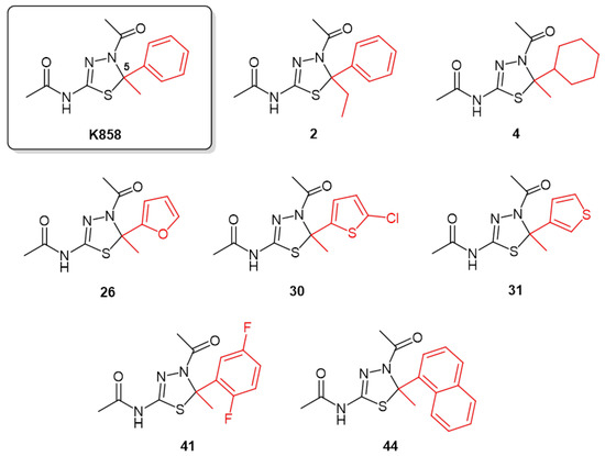 Based on this knowledge, starting from monastrol, the first Eg5 inhibitor discovered in 1999 [10], a number of Eg5 inhibitors were then discovered, synthetized, and used in basic and clinical research [11]. In our laboratory, seven novel kinesin Eg5 inhibitors (2, 4, 26, 30, 31, 41, and 44) were synthesized keeping constant the thiadiazoline core nucleus and modifying the C5 substituents of K858, the most common Eg5 inhibitor used in cancer therapies, due to their promising inhibition of the basal Eg5 ATPase activity (0.84 < IC50 (μM) < 7.5) in vitro [12].