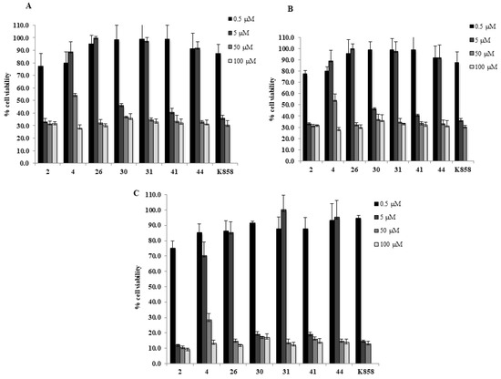 MTT cell viability assay on AGS. Histograms represent the viability dose-response of AGS cells exposed to different concentrations of compounds 2, 4, 26, 30, 31, 41, 44, and K858 (from 0.5 to 100 μM) for 24, 48, and 72 h (A–C, respectively). Metabolic activity was assessed using MTT assay and normalized to control cells treated with DMSO (0.2% as final concentration).