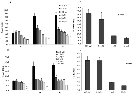 MTT cell viability assay on AGS. (A,C) Histograms represent the viability dose-response of AGS cells exposed to different concentrations of 2, 41, 30 (from 3.125 to 100 μM) for 24 and 48 h. (B,D) Histograms represent the viability dose-response of AGS cells exposed to different concentrations of K858 (from 0.05 to 50 μM) for 24 and 48 h. Proliferation was assessed using MTT assay and normalized to control cells treated with DMSO (0.2% as final concentration).