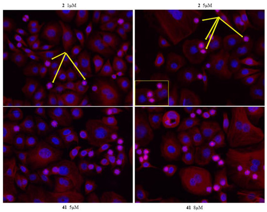 β-tubulin immunofluorescence analysisin AGS cell line treated with compounds 2 and 41for 24 h. AGS cells were treated for 24 h with 2 and 5 μM of compound 2 and with 5 and 8 μM of 41. Tubulin cytoskeleton was visualized following fixation by immunostaining, DNA was stained with DAPI. After 24 h of compounds 2 and 41 treatment, the majority of AGS cells arrested in mitosis resulting in formation of monopolar spindle (yellow arrow).