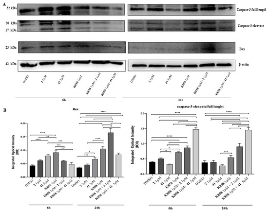 To identify the effects of 1 μM of compounds 2, K858 and of 5 μM of compound 41 as single agents and in co-treatment with 1 μM of K858 on the apoptotic process, Western blotting analysis of Bax and Caspase-3 was carried out after 6 and 24 h of compounds administration. After 6 and 24 h a significant increase in Bax expression is evidenced in cells exposed to compound 41 and K858 as single agents compared to DMSO and to sample treated with compound 2; after 24 h of exposure the co-treatment of compound 2 and K858, both used at 1 μM, reveals a strongly increase in Bax expression respect to DMSO and to all other experimental points. After 6 h of exposure a higher expression of the pro-apoptotic protein is reported in samples treated with 1 μM K858 respect to samples treated with compound 2 as single agent and respect to compounds 2 and 41 in co-administration with K858. Moreover, after 24 h of treatment, a remarkable increase in protein level is shown in cells treated with compound 2 in co-administration with K858 respect to all other experimental points (Figure 6).