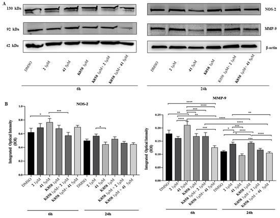 Then, a Western blotting analysis of Nitric Oxide Synthase (NOS-2), involved in the inflammatory event induction, was carried out. After 6 h, NOS-2 expression is slightly augmented in samples exposed to 5 μM of compound 41 compared to DMSO sample and considerably augmented in respect to compound 2 in co-administration with 1 μM K858. Additionally, after 24 h a slight increase is found in cells treated with 2 in respect to cells treated with compound 41 (Figure 7). Moreover, a Western blotting of Matrix Metalloproteinase 9 (MMP-9), a protease responsible for the remodeling and turnover of extracellular matrix, was carried out. After 6 h, MMP-9 expression is remarkably increased in samples exposed to 5 μM of compound 41 compared to DMSO and to all other experimental points, while after 24 h cells treated with compound 41 show a significantly lower MMP-9 expression level than cells treated with compound 2 and K858. At both time points samples treated with compound 41 in co-administration with K858 report a notable reduction of protein level expression compared to samples exposed to compound 2 as a single agent, while after 6 h no significant difference in samples treated with compound 2 in co-administration with K858 with respect to DMSO and samples exposed to compounds 2 and 41 is evidenced. Conversely, after 24 h exposure a slight reduction in samples treated with compound 2 in co-administration with K858 with respect to samples treated with compound 41 and K858 is reported (Figure 7).