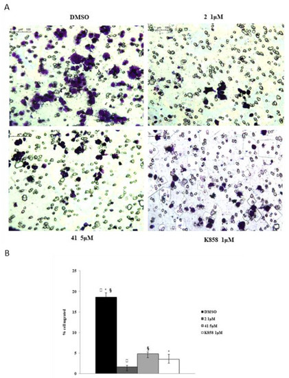 Transwell migration assay in AGS cell line in the presence of compounds 2, 41 and K858. Dose treatments are 1 μM for compound 2 and K858, and 5 μM for compound 41, respectively. (A) Images represent migrated cells after staining with crystal violet. (B) Histogram represents densitometric analysis determined by quantifying thresholded area for violet color in 10 fields for each of three slides per sample. Data are presented as mean ± standard deviation. *K858 1 μM vs. DMSO; §compound 41 5 μM vs. DMSO; ▯compound 2 1 μM vs. DMSO: p < 0.0001.