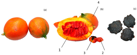 Gac fruit is a tropical fruit that is used as a health food and traditional medicine in East and Southeast Asia. In Vietnam, the red aril that surrounds the seeds of mature gac fruit is usually consumed in the traditional recipe Vietnamese “Xoi Gac” [4]. The fruit, especially aril, is rich in carotenoids, β-carotene, and lycopene [6], which can be used for the treatment of infantile rickets, xeroma, and night blindness, according to the traditional Vietnamese documents [7,8]. In Thailand, immature gac fruits and shoots are taken as vegetables. In Guangxi province, southwest of China, people also have the custom of eating Momordica cochinchinensis seedlings, which are rich in vitamin C, vitamin B2, lycopene, beta carotene, and total carotenoids [9,10,11,12,13]. The anatomy of gac fruit from Guangxi, China is shown in Figure 1.