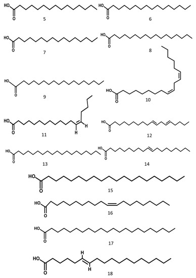 The aril of gac contains a high concentration of oil that is composed of several types of fatty acids. Similarly, fatty acids are also rich in the seeds [17]. MSE contained primarily stearic acid (60.5%), smaller amounts of linoleic (20%), oleic (9%), and palmitic acids (5%–6%), and trace amounts of arachidic, etc. [8]. Fourteen kinds of fatty acids were identified from MSE, accounting for 89.32% of the total fatty acid content, of which the unsaturated fatty acid content was 41.91% [18]. Gac aril contained 22% fatty acids by weight, composed of 32% oleic, 29% palmitic, and 28% linoleic acids. The fatty acids concentration was 101.98 mg·g−1 edible portion in gac pulp [19]. The unsaturated fatty acids of MSE have various effects on the body, such as adjusting blood fat, cholesterol, blood pressure, and preventing cancer [18]. The structures of the main compounds are shown in Figure 3.