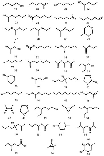 The volatile constituents of MSE mainly consist of alkanes, esters, alcohols, ketones, ethers, aldehydes, and organic acids [20]. The structures of the main compounds are shown in Figure 4.