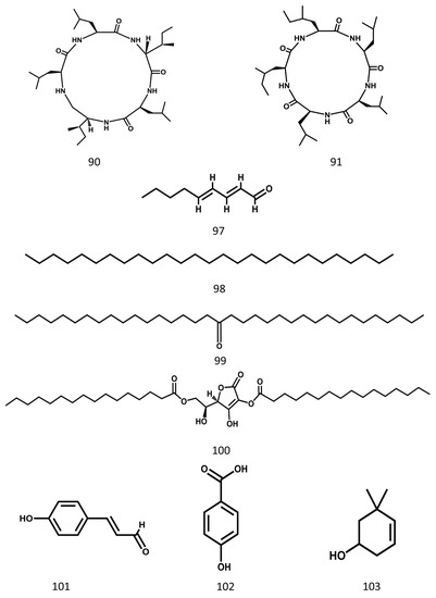 The ethyl acetate extract of MSE has been shown to have anti-tumor activity and was proved both in vivo and in vitro. Nude mouse xenotransplant models that were induced by injecting MDA-MB-231 cells subcutaneously into the right axilla of the mice proved that the extract could inhibit the growth of tumors. An experimental group was intraperitoneally injected with the ethyl acetate extract in the dosage of 50 mg·kg−1 (the 10% lethal dose) and 25 mg·kg−1 (the 5% lethal dose) once a day for 14 days. The results showed that the tumors in the group treated with the extract (25 or 50 mg·kg−1) were smaller and lighter [30]. A cell test also confirmed the anti-tumor activity of MSE. After 48 h of treatment with the extract, it showed a significant anti-proliferative effect on MDA-MB-231 cells in the dosage range of 8 to 250 μg·mL−1. Furthermore, the 50% inhibitory concentration (IC50) was 35.04 µg·mL−1. Its anti-tumor effect is attributed to inducing cell death, G2-phase arrest, apoptosis, and was mainly related to octadecanoic acid (9, Table 1, Figure 3), [(2S)-2-[(2R)-4-hexadecanoyloxy-3-hydroxy-5-oxo-2H-furan-2-yl]-2-hydroxyethyl] hexadecanoate (100, Table 1, Figure 8), (2E,4E)-nona-2,4-dienal (97, Table 1, Figure 8), and other components [30].