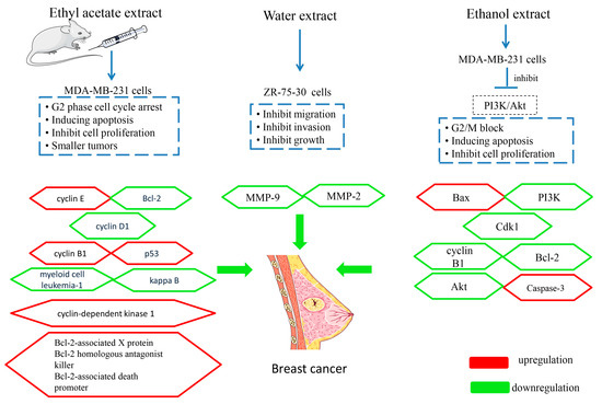 Ethanol extract of MSE can relieve the suffering caused by breast cancer. After 48 h of treatment with the extract, MDA-MB-231 cells proliferation was inhibited, cells apoptosis was induced, and the cell cycles were blocked in the dosage range of 0.1 to 0.4 mg·mL−1. Treated with MSE extract for 48 h, apoptotic evidences such as nuclear fragmentation, fluorescence, and typical apoptotic morphology could be found. Furthermore, the effects on MDA-MB-231 cells were in a dose-dependent manner. The mechanism induced apoptosis, and G2/M phase cell cycle arrest in MDA-MB-231 cells takes place to decrease the expression of the phosphatidylinositol 3-kinase/ protein kinase B (PI3K/Akt) pathway [40].