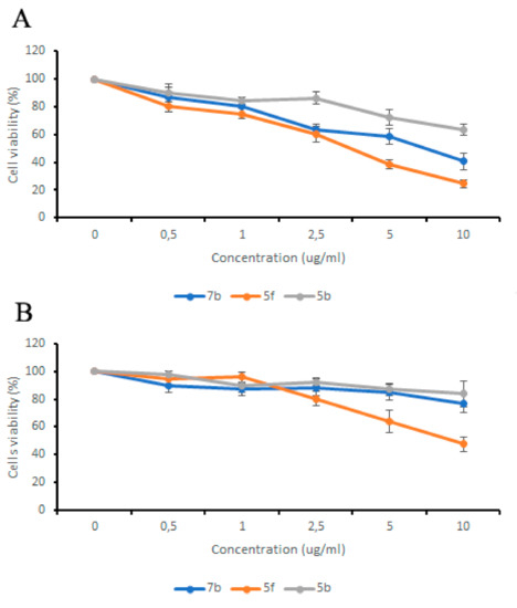 To test if compounds 5b, 5f, and 7b had an inhibitory effect on cell proliferation, the antiproliferative activity was assessed in both a cancer cell line (HeLa) and in normal cells (Vero). As shown in Figure 1A,B, all three compounds were active against cancer and normal cells. Compound 5f was more potent against HeLa (IC50 = 4.4 ± 0.3 μg/mL) and Vero (IC50 = 6.4 ± 0.4 μg/mL) cells than compounds 7b (HeLa: IC50 = 5.4 ± 0.2 μg/mL; Vero: 13.7 ± 0.4 μg/mL) and 5b (HeLa: 8.4 ± 0.2 ug/mL; Vero: 16.8 ± 0.6 μg/mL) were. In general, all tested compounds were less cytotoxic against Vero, indicating low cytotoxicity toward normal cells.