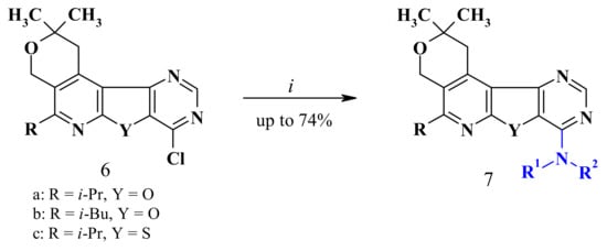 In turn, the nucleophilic substitution of 8-chloro-2,2-dimethyl-1,4-dihydro-2H-pyrano[4″,3″:4′,5′]pyrido[3′,2′:4,5]furo(thieno)[3,2-d]pyrimidines (6a–c), the second starting compounds previously synthesized by us [13], with a series of amines gave (in very high yields, from 74% to 89%) the aimed-for pyrano[4″,3″:4′,5′]pyrido[3′,2′:4,5]furo(thieno)[3,2-d]pyrimidin-8-amines (7a–m) [13,20] (Scheme 2).
