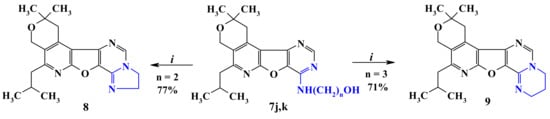 In the following step, the new heterocyclic systems, i.e., 11-isobutyl-8,8-dimethyl2,3,7,10-tetrahydro-8H-imidazo[1,2-c]pyrano[4″,3″:4′,5′]pyrido[3′,2′:4,5]furo[2,3-e]pyrimidine (8) and 12-isobutyl-9,9-dimethyl3,4,8,11-tetrahydro-2H,9H-pyrano[4″,3″:4′,5′]pyrido[3′,2′:4,5]furo[2,3-e]pyrimido[1,2-c]pyrimidine (9), were synthesized from compounds 7j,k by simple refluxing with phosphorus oxychloride followed by treatment with a base (Scheme 3). The disappearance of NH and OH groups in the 1H-NMR spectrum of compounds 8 and 9 supported the cyclized structures.