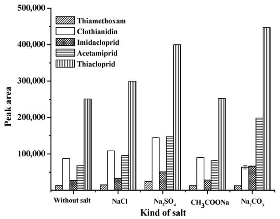 The amount of sodium carbonate for extraction efficiency of the studied neonicotinoids was also investigated and found to be within the range of 0.25–3.0 g. The relevant data are shown in Figure 2. It was found thatextraction efficiency, in terms of peak area of all target analytes, increased with a rise in sodium carbonate, up to 3.00 g. Beyond this point, it cannot dissolve in the solution, as it reaches its equilibrium. Therefore, 3.00 g of sodium carbonate was chosen for further studies.
