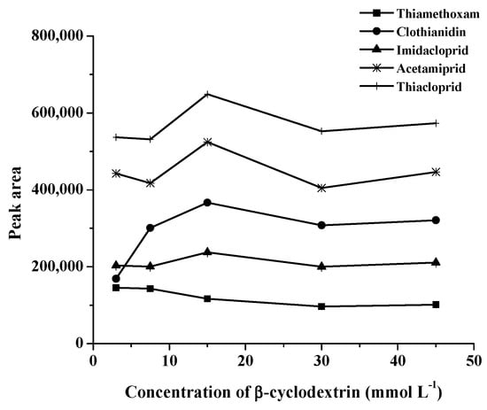 Cyclodextrin was found to reduce the interfacial tension between two phases by forming organic solvent/cyclodextrin complexes as the liquid-liquid interface and increasing the contact area between two phases. β-CD is composed of glucopyranose units, which simultaneously occupy hydrophobic cavities and hydrophilic external surfaces, and has been widely used for separation []. For the above-mentioned procedure, β-CD was chosen as a disperser solvent. The effect of β-CD concentration on the extraction efficiency of the neonicotinoid standards was studied for the range of 3–45 mmol L−1. The relevant data are shown in Figure 3. There was an enhancement of extraction efficiency for all neonicotinoids when 15 mmol L−1 β-CD was added. This is because the droplet size of the 1-octanol/β-CD emulsion decreased with increasing β-CD concentration. Therefore, β-CD 15 mmol L−1 was selected as a disperser solvent.