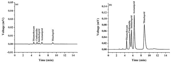 Five neonicotinoid insecticides were separated within 9 min with the elution order of thiamethoxam (tR = 4.54 min), clothianidin (tR = 5.30 min), imidacloprid (tR = 5.76 min), acetamiprid (tR = 6.45 min), and thiacloprid (tR = 8.91 min).