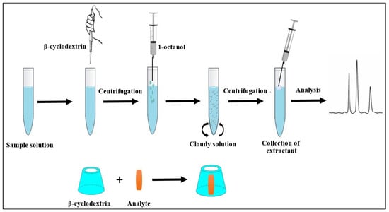 Recently, cyclodextrin was introduced into DLLME by Chen et al. [] as a disperser solvent instead of an organic solvent. Cyclodextrin (CD) or cyclomaltoheptases are a well-known series of macro-cyclic oligosaccharides resulting from the degradation of starch by bacterial enzymes []. β-Cyclodextrin (β-CD) is an important cyclodextrin, composed of seven d-glucopyranose units, linked by α-1,4-glycosidic bonds []. It is a truncated cone-shaped macrocyclic molecule with a hydrophobic inner cavity (due to the presence of glycosidic oxygen bridges and hydrogen atoms) and a hydrophilic exterior (due to the presence of primary and secondary hydroxyl groups) [,], making β-CD an attractive host molecule in host-guest chemistry and supramolecular chemistry. It can stick selectively various organic, inorganic, and biological guest molecules as “a molecular shape sorter”, which are geometrically fit and less polar than water, into its cavity via non-covalent interactions to form stable host-guest inclusion complexes or nanostructured supramolecular assemblies. Thus, β-CD has the remarkable ability to recognize certain analytes in a highly selective and sensitive genre. β-Cyclodextrin (β-CD) has a remarkable capacity to select certain analytes because of its hollow truncated cone structure with a hydrophobic cavity and hydrophilic wall, allowing it to trap and hold targets of a certain size, with polarity in the cavity generating invertible and noncovalent inclusion complexes. Over recent years, the application on β-CD has gradually been extended and the host-guest type molecular recognition has been practically used in many fields, such as chemical separation [], adsorbents [], and food processing []. The first application by cyclodextrin-assisted dispersive liquid-liquid microextraction was reported in 2018 by Chen et al. [] for preconcentration of carbamazim and clobazam. In this work, α-cyclodextrin was used as the dispersive solvent and chorinated solvent (chlorofrom) was selected as an extraction solvent. To be compatible with the mobile phase of HPLC, the extract was then evaporated to dryness and re-dissolved with a solvent before analysis.