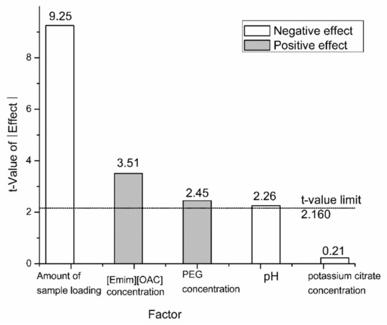 The influence of the main effects on the yield of capsaicin were analyzed with a Pareto chart. The line of the t-value limit is a reference. The factor has a significant contribution to the response as the t-value above the reference line (p < 0.05). Gray indicates that the effect of this factor is positive, and white indicates that the effect of this factor is negative.