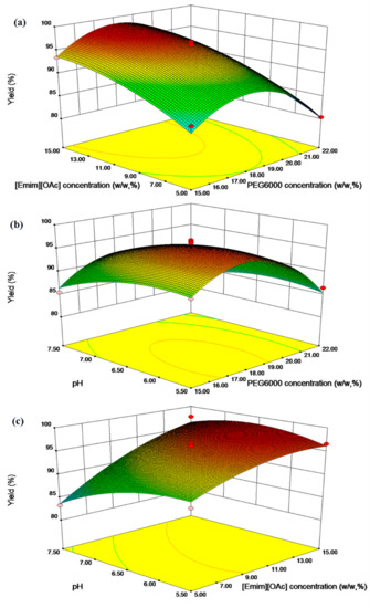 The response surface plot were shown as follows: (a) The effect of the concentration [Emim] [OAC] and PEG6000 on the response at pH 6.5. (b) The effect of the concentration of PEG6000 and pH on the response when the [Emim] [OAC] concentration was 10% (w/w). (c) The effect of the pH and concentration of [Emim] [OAC] on the response when the PEG6000 concentration was 18.5% (w/w).