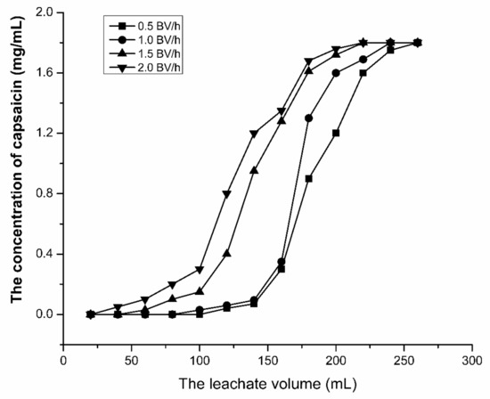 Based on the experiment above, the influence of the sample loading flow-rate was discussed. The leak curves were drawn and shown in Figure 5. From the leak curves (Figure 5), we can see that the sample loading flow-rate has great influence on the adsorption performance of capsaicin no to SKP-10-4300. While the sample loading flow-rate is up to 1.5 BV/h, the adsorption capacity is decreased significantly. It is attributed to the fact that the adsorption of weakly polar capsaicin on a non-polar porous structure of reversed-phase resin takes a certain amount of time. If the flow rate is too high, the target component is less likely to be adsorbed on the resin and is eluted by the loading solvent. However, it will take a long time to load the same volume of the loading solution at a low flow rate. Thus, considering both adsorption rate and production efficiency, the flow rate of the sample loading was finally selected to be 1.0 BV/h.