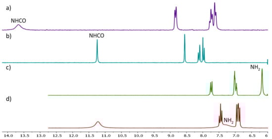 The desired products can be thus isolated in a repeatable manner and employing the usual purification procedures. Acylation of luminol and isoluminol is evident in the 1H-NMR spectra of the derivatives, where characteristic patterns appear, as shown in Figure 1. All signals are shifted downfield, as compared to their parent compounds, while the newly-obtained amide NH protons appear quite deshielded. The hydrazide proton signals are not always evident, usually appearing as very broad peaks of variable chemical shift (12–8 ppm), quite sensitive to moisture, solvent traces, and sample concentrations.