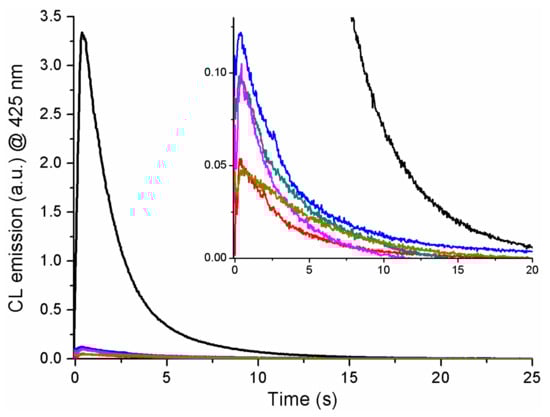 Results of a typical experiment to determine the chemiluminescence of the amino-acylated derivatives 1a (blue), 1b (green), 1c (red), 1d (magenta), 1e (olive), and luminol (black) in aqueous basic solutions. Inset: magnification.