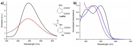 It is widely accepted that the oxidation of luminol leads to the formation of 3-aminophthalate (3AP) in its excited singlet state (Scheme 4, step A). In part, this excited species (13AP*) relaxes to its ground state through the emission of light at 425 nm (Scheme 4, step B), thus producing the observed chemiluminescence in the global process. Taking this into account, the dramatic decrease of CL upon acylation could originate by a diminution in the yield of the oxidation and/or the emission steps. To ascertain which is the key step affected, the fluorescence of 3-heptanamidophthalic acid 14 was measured as reference compound (closely related to the emitting species in the CL of 1, prepared in two steps from 3-nitrophthalic acid) and compared to that of 3APH (Figure 3a) [47]. To this end, two alkaline isoabsorptive solutions of 3APH and 14 were excited at the same wavelength (λexc = 303 nm) to ensure that both absorb the same number of photons. The fluorescence spectra were then recorded and revealed that the emission quantum yields are of the same order, albeit significantly different (ΦF = 0.17 for 14, as compared with ΦF = 0.30 [48] for the reference compound 3APH). This sole parameter does not justify the remarkable CL variations, which have to be attributed to the lower yield of aminophthalate formation from the oxidation reaction, possibly due to the lower electron donating capability of the aromatic ring substituent. Accordingly, the perturbation of the electronic distribution of the benzenoic chromophore is reflected in the significant changes observed in the UV–vis spectra (Figure 3b).