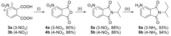 Synthesis of aminophthalimides 6a,b. Reagents and conditions: (i) Ac2O, Δ; (ii) sec-BuNH2, AcOH, Δ; (iii) H2, Pd/C, MeOH.