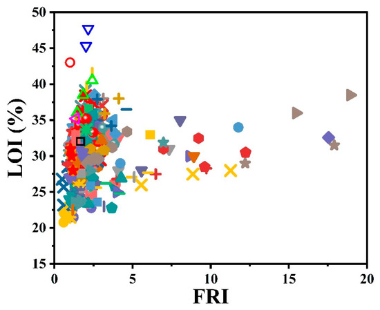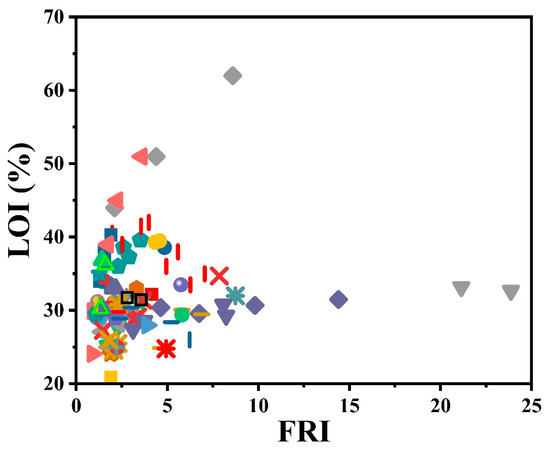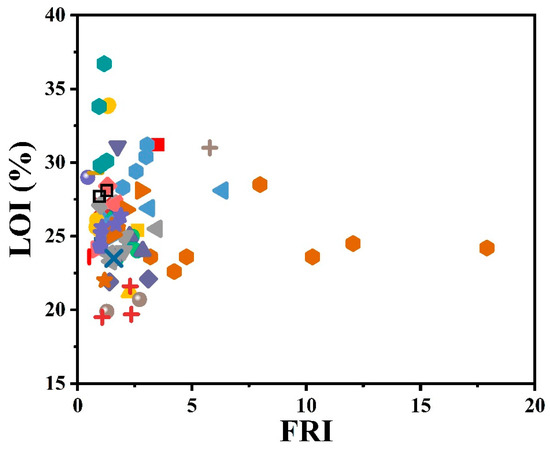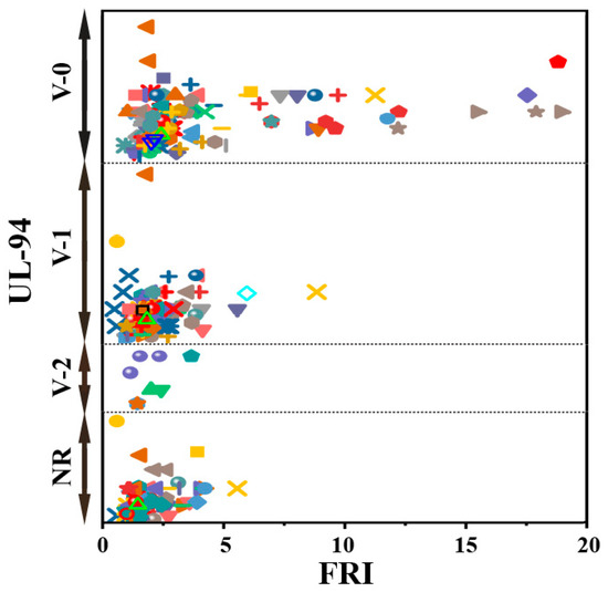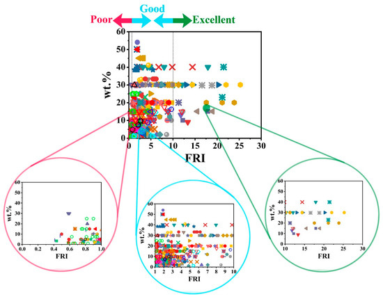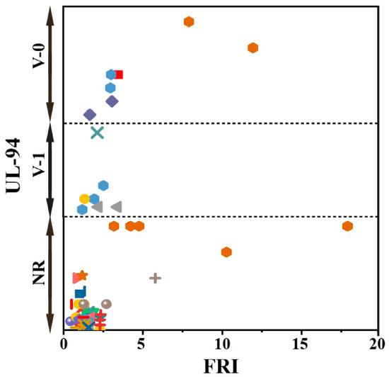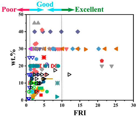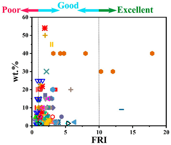A brief yet informative view of the effect of the used P family of FRs on the flame retardancy performance of epoxy resins is given in Figure 1. It is apparent from the figure that all sorts of behavior, including Poor, Good, and Excellent flame-retardant performance, are achieved. This is the characteristic of dependency of flame retardancy performance on both the type and the content of the P type of FR. It can be observed that the majority of epoxy systems contains less than 20 wt.% of phosphorus flame retardants. For instance, a compromise between FRI and FR loading percentage was achieved by incorporation of encapsulated ammonium polyphosphate (APP-