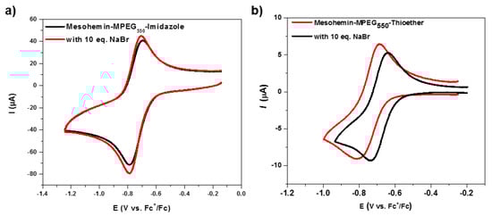The modified mesohemin complexes were characterized by mass spectroscopy, Ultraviolet–visible (UV-Vis) spectroscopy, Infrared (IR) spectroscopy (Figure S1–S8) and cyclic voltammetry (CV; Figure 2a). According to CV measurements, the iron porphyrins formed complexes with varied redox potential E1/2., indicating different reactivity. Two new complexes were characterized by less negative E1/2values when compared to the fully PEGylated mesohemin, but formed only a single catalytic species, even in the absence of excess bromide [,]. Imidazole-modified mesohemin was not significantly affected by the addition of excess bromide ions, but the CV of the thioether-modified mesohemin showed a shift towards a more negative potential (Figure 2b).