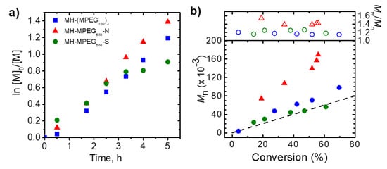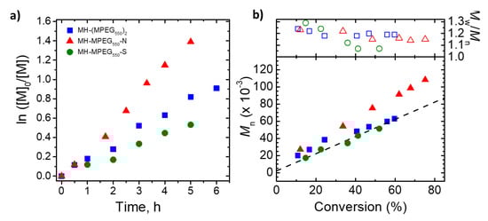 In one such optimization, the addition of less reducing agent in a polymerization catalyzed by MH-MPEG-N resulted in a linear first-order kinetics and linear increase of MW with conversion, with values of MW close to theoretical values. This polymerization resulted in the formation of polymers with dispersity values lower than previously obtained with MH-(MPEG)2,, indicating that conditions had been selected that provided a better controlled polymerization. Additionally, the reaction was faster despite decreased amounts of reducing agent.