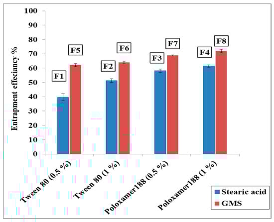 As shown in Figure 1, it was revealed that the EE% of CBZ was higher in case of poloxamer 188 than in case of Tween 80. The EE% of CBZ for formulations prepared with poloxamer 188 was 58.16 ± 1.15–71.91 ± 1.20%, while for formulation prepared with Tween 80, it was 39.66 ± 2.42–63.95 ± 0.89%. This may be due to the higher HLB value (Hydrophilic Lipophilic Balance) of poloxamer 188 than that of Tween 80 [37]. This was similar to the result obtained by Ekambaram et al. [37], who found that the entrapment efficiency of various Ramipril SLNs stabilized with different nonionic surfactants, and the EE% in case of poloxamer 188 was greater than that of Tween 80 and Span 20.