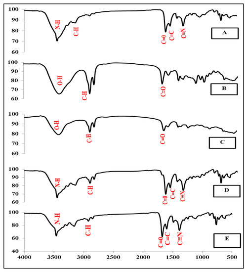 As shown by Figure 5C, the IR-spectra of stearic acid showed characteristic peaks of broad O–H stretching at 3435.56 cm−1, C–H stretching at 2919.7 cm−1, and C=O stretching at 1698.98 cm−1. These results are in agreement with those obtained by Garg et al. [43].