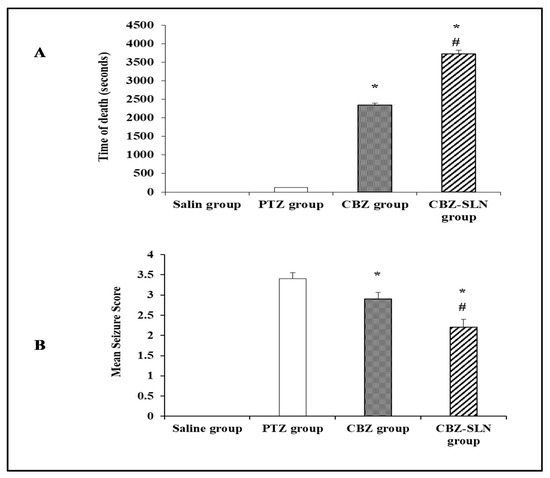 As shown by Figure 7A, it was found that the prepared CBZ-SLN successfully antagonized the lethality of PTZ. The results illustrated by Figure 7A showed that the time to death calculated for the CBZ-SLN group was significantly higher than that calculated for the CBZ and PTZ groups. The time to death for the PTZ, CBZ, and CBZ-SLN groups was found to be 120 ± 2.48, 2340 ± 140.71, and 3720 ± 244.95 s, respectively, p < 0.05. The prolonged anticonvulsant effect of the prepared CBZ-SLN formulation in comparison with the free CBZ aqueous dispersion may be attributed to the sustained drug release from the SLN and the enhanced absorption of the CBZ-SLN [11,40].