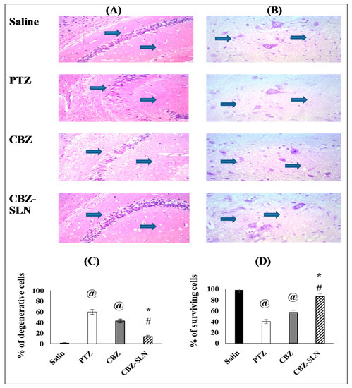 From the histopathological examination, it was shown that the percentage of surviving cells in the saline group was 100%; in the PTZ group, it was 40.27%; in the CBZ group, it was 56.89%, and in the CBZ-SLN group, it was 86.30%, see Figure 8D.
