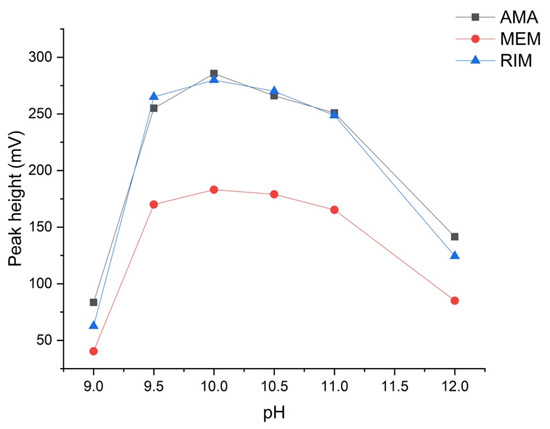 The pH proved to be a critical variable for all compounds. Its effect was evaluated in the range of 9.0–12.0, using 100 mmol L−1 carbonate buffer. As can be seen in the experimental results in Figure 1, a clear maximum at a pH value of 10 was observed for all analytes. The type of buffer proved to have no effect (carbonate vs borate vs Britton–Robinson).