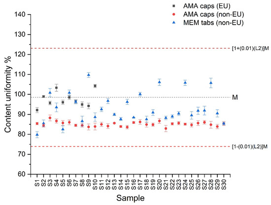 Pharmaceutical samples included both EU-licensed products—purchased from local pharmacies—and non-EU-licensed formulations—purchased from web-pharmacies. Three lots of MEM oral drops (10 mg mL−1) were analyzed directly, after 10-fold dilution in water. AMA capsules (100 mg per cap) and MEM tablets (5 mg per tab) (n = 10) were ultrasonically dissolved in water followed by filtration through 0.45 μm syringe filters and dilution with water to meet the 100% level concentration. For content uniformity tests, ten capsules or tablets from each formulation were treated individually (n = 10) as indicated by the U.S. pharmacopoeia [21].