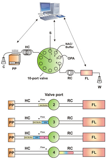In order to improve the sensitivity of the analytical procedure, preliminary experiments were also focused on a stopped-flow step prior to FL detection. The advantage of the stopped-flow technique is the minimization of the radial dispersion effect that results in broad peaks and competes to the sensitivity gain due to the increased reaction time. Stopped-flow can be either applied in the flow cell or in a suitable coil before detection. The former approach is advantageous on the basis of monitoring the reaction in real time. However, our experiments proved that the OPA derivatives were not stable under the flow-cell conditions (e.g., light and temperature) [18]. For this reason, the stopped-flow step was carried out in a reaction coil (RC, 60 cm/0.5 mm i.d.) prior to entering the detector.