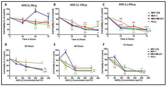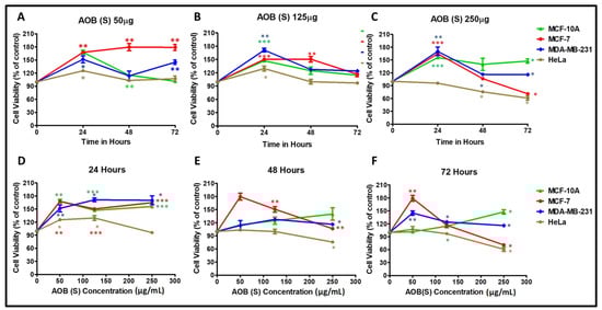 Cytotoxic effects of A. orientalis dichloromethane leaf fraction (AOB (S)) using the MTT assay on MCF-10A, MCF-7, MDA-MB-231, and HeLa cells in a dose- (A–C) and time- (D–F) dependent manner after normalizing to the effects of DMSO solvent used to dissolve the extract. *indicates statistically significant differences between the DMSO- and AOD (L)-treated samples (* p < 0.05; ** p < 0.01 but >0.001; *** p < 0.001).