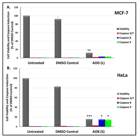 To explore the potential mechanism of action of the effective leaf and stem fractions, their ability to induce apoptosis was explored, being the most widely induced type of cell death pathway observed in cancer [23,24]. To this end, the Promega Caspase-Glo®assays were used to detect activation of caspase enzymes 3/7, 8, and 9, that are classically activated upon apoptosis [23]. Since AOD (L) was equally effective in both breast and cervical cancer cell lines (Figure 2), MCF-7 cells were selected to test its efficacy in activating the caspases, while HeLa cells were selected for the treatment with AOB (S) as they were the most significantly affected cell line. All results obtained for the induction of caspases were normalized to the number of viable cells in culture (Figure 3).