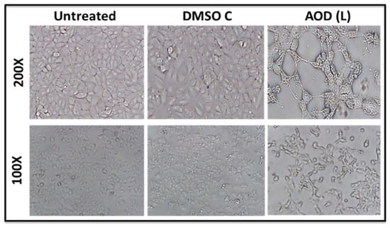 Morphological analysis of MCF-7 cells treated with AOD (L) under a light microscope revealed a lack of cell rounding, shrinkage, and detachment from other cells, all characteristic of cells undergoing apoptosis (Figure 4); rather, the treated samples revealed morphological changes reminiscent of autophagy—a marked appearance of vacuoles in the cell cytoplasm and loss of cells from the monolayer without cell rounding (Figure 4) [31,32].