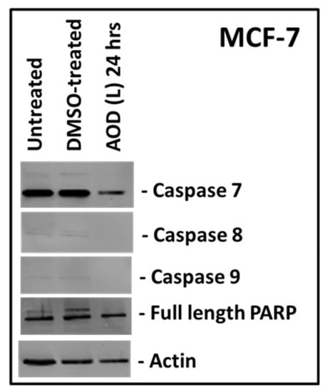 To confirm these results, we tested the ability of AOD (L) to induce cleavage of apoptosis-specific proteins via western blot analysis. MCF-7 cells were treated with AOD (L), and cell lysates were prepared, and tested for the expression and cleavage of various caspases and poly ADP-ribose polymerase (PARP), the two major hallmarks of a cell undergoing apoptosis (Figure 5) [23]. As can be seen, cleavage of none of the three caspases tested (caspase 7, 8, or 9) could be detected; however, some loss of the pro form of these caspases could be detected as well as full-length PARP at 24 h post treatment compared to actin control (Figure 5). This suggests that AOD (L) may have a slight potential to activate caspases in MCF-7 cells that one cannot rule out since crude fractions are being tested where concentration of the active compounds could be very low.