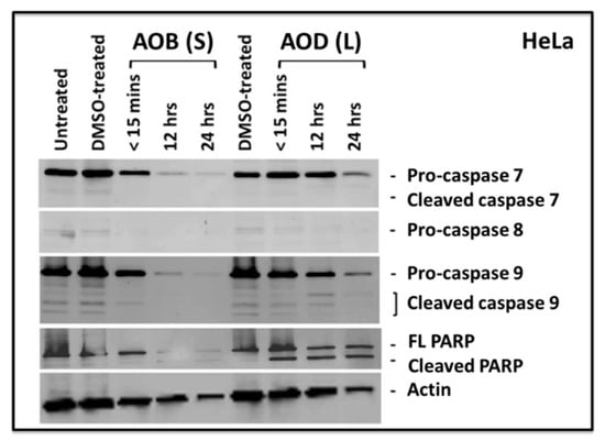 Since caspase 8 and 9 were difficult to detect in MCF-7 cells, while AOD (L) was equally cytotoxic in HeLa cells, therefore we decided to test HeLa cells treated with either AOD (L) or AOB (S) to analyze their ability to induce activation of apoptotic proteins. As can be seen in Figure 6, both fractions were capable of inducing cleavage of PARP, while a time-dependent disappearance of the pro forms of caspase 7, 8, and 9 could be observed (Figure 6). Some effect of the tested fractions on actin degradation could be observed at 24 h, suggesting late stages of apoptosis when actin degradation has been observed [29,33]. This is supported by the observation that PARP cleavage could be detected at the earlier time points (<15 min and 12 h) in the absence of effects on actin integrity (Figure 6). Furthermore, the inability to detect caspase cleavage products despite clearly detecting PARP cleavage at multiple time points and with both fractions could be due to the well-known unstable nature of the cleaved caspase products and the inability of the antibody to detect them properly [34]. This assertion is further supported by our earlier observation that we could detect statistically significant levels of caspase 8 and 9 enzymatic activity in our caspase Glo assays (Figure 4).